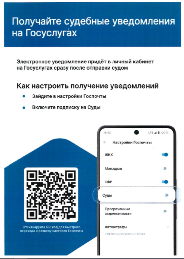 Чтобы получать уведомления из судов, необходимо дать согласие в соответствующем разделе портала Госуслуг в настройках личного кабинета: 1.Войдите в личный кабинет приложения Госуслуг. 2.В разделе "Профиль" откройте вкладку "Настройка Госпочты". 3.Выберите параметр "Суды" и включите получение электронных писем.